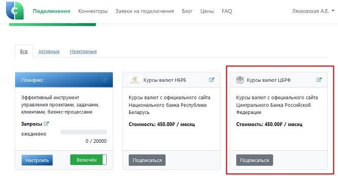 Каждый коннектор имеет свою цену — от 450 и до 3000 рублей в месяц на текущий момент. Окончательная сумма зависит от сроков использования функционала, действующих скидок и автоматически рассчитывается в системе.